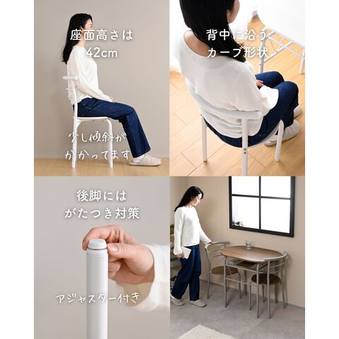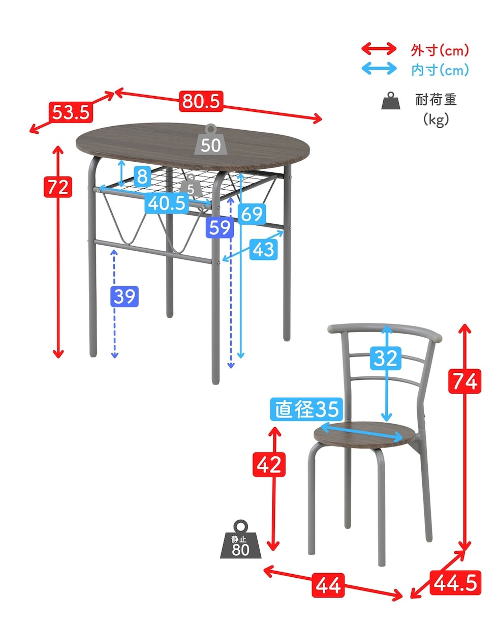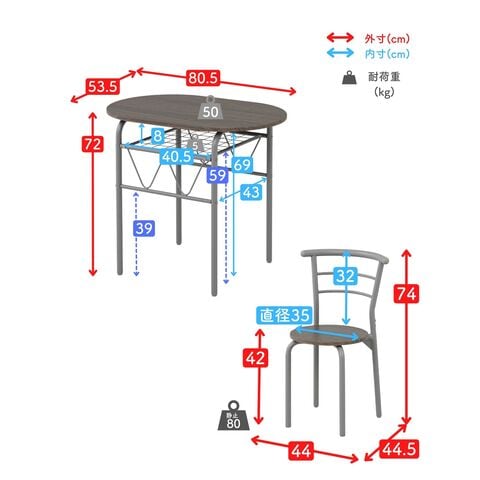 | 本体サイズ | 【テーブル】 幅80.5×奥行53.5×高さ72cm 重量 8.5kg 【チェア】 幅44×奥行44.5×高さ74cm、座面高さ42cm 重量 3.5kg |