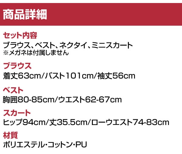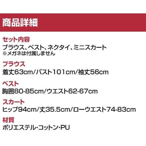 | 商品説明 | ●セット内容:ブラウス、ベスト、ネクタイ、ミニスカート メガネは付属しません ●女性が憧れる女性に華麗に変身をコンセプトに掲げ、非日常で大胆なコスチュームデザインがポイント |