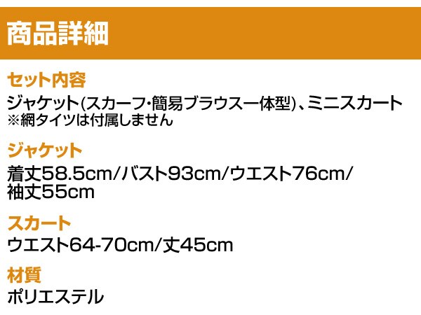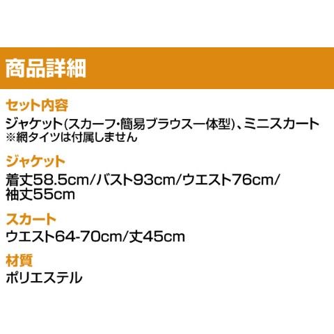 | 商品説明 | ●セット内容:ジャケット(スカーフ・簡易ブラウス一体型)、ミニスカート ※網タイツは付属しません ●女性が憧れる女性に華麗に変身をコンセプトに掲げ、非日常で大胆なコスチュームデザインがポイント |