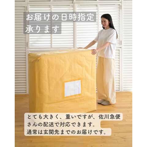 | 商品説明 | ●開梱にはさみが必要です。 ※大型品です。通常玄関先までのお届けとなり、屋内への移動や設置はお二人以上をおすすめいたいします。 ※開梱時、内部フレームの天然木の臭いがこもっていることがございますが、換気に緩和されます。 ※2024年11月29日より、木脚高さを15→19cmへ変更します。 ●移動や日々のお掃除を簡単にする、分割タイプの脚付きマットレス ●より長くお使いいただけるよう、前後を入れ替えてローテーション可能 ●マットレスはヘタリにくいコイルスプリング ●スプリング数: 256個(線径:2.3cm) ●脚部を取り付けるだけの簡単組立て式 ●脚部には傷防止フェルト付属 ●張地は高級感ある多針キルティング ●マット全体厚さ:20cm ●マット下内寸:幅77 高さ19cm ●コイルスプリング:256個 ●静止耐荷重:200kg(保証値ではございません。) 本製品は7000N(700kg相当)の荷重試験をクリアした商品です。当社では安全を考慮し、本商品は耐荷重200kgに設定しております。 ●お届けサイズ:1個口、103×98×38cm、約25kg |