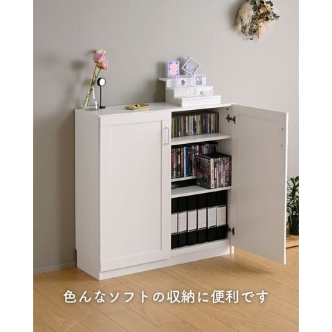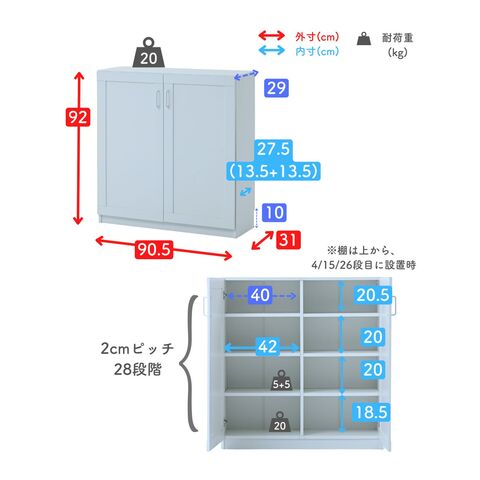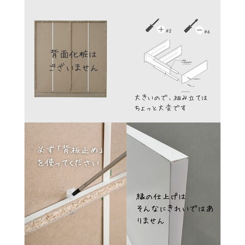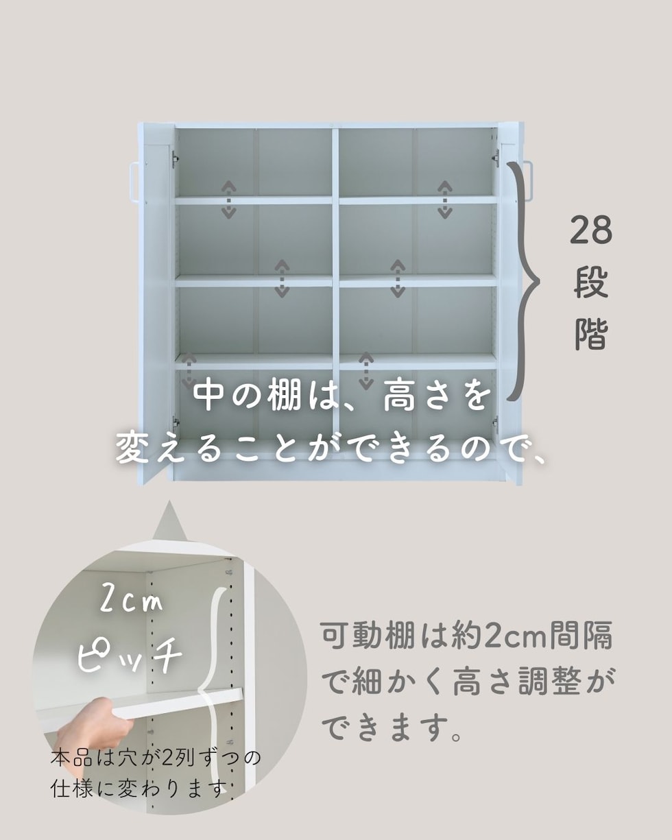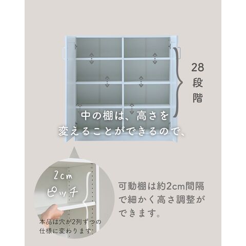 | 商品説明 | ●プラスドライバーをご用意ください。 ※2025年12月26日より、扉付きタイプに改良し、色も変更になります。 ※必ず背板止めを取り付けて組立ててください。 ●見せるディスプレイ収納と、「すっきり」隠せる扉付き収納のミックスアイテム ●可動棚は前後に分離でき、奥がチラ見えする段差収納も可能 ●土台は袴式で、床から底上げできて掃除機もかけやすくホコリの侵入も予防 ●分割式可動棚計6枚、2cm間隔、28段階 ●間口幅: 片側40cm ●棚板内寸目安:幅42 奥行13.5(全体27.5) cm ●棚板間高さ: (手前/奥) 20.5/18.5、20/20、20/20、18.5/20.5cm ※棚は上から(手前/奥) 4/3段、15/14段、26/25段目に設置時 ●耐荷重: 分割棚板1枚あたり5kg ●木ネジ式の転倒防止ベルト付属 ●背面化粧なし ●巾木除け高さ約10cm |