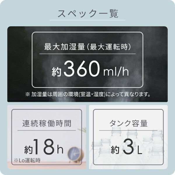 | 商品説明 | ●電源:AC100V(50/60Hz) ●消費電力:270W ●電源コード長さ:約1.5m ●水タンク容量:3L ●加湿量:「Lo」160ml/h、「Hi」360ml/h ●連続使用時間:「Lo」18時間、「Hi」8時間 ●適用床面積目安:木造和室~6畳/プレハブ洋室~10畳 ●安全装置:給水ランプ(赤色)点灯時ヒーターOFF(空だき防止機能)、電流ヒューズ、温度ヒューズ、サーモスタット(温度過昇防止装置) ●上から給水ができる上部給水仕様 ●アロマ対応 ●付属品:水垢フィルター ●メーカー保証:1年間 ※2025年9月から型番をKS-D254からKS-AA30に変更しております 【仕様変更点】 ・外観デザインを変更して給水方式をタンク式から上部給水に変更しております ・タンク容量:2.5L→3Lに増やしております ・加湿量設定を強弱2段階に変更しております ・適用床面積の目安:木造和室~6畳/プレハブ洋室約9畳まで→木造和室~6畳/プレハブ洋室~10畳に変更しております |