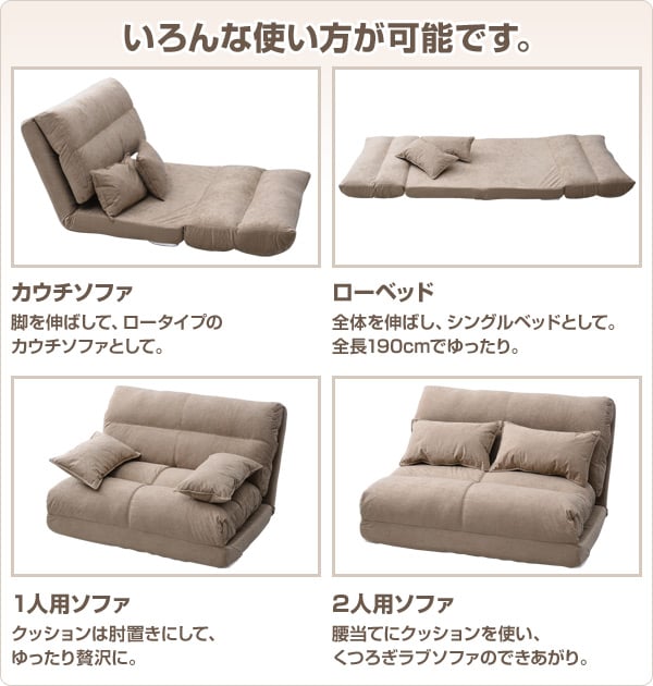商品説明 ●ソファとして、足を伸ばせるカウチソファとして、ごろ寝マットとして使える3way仕様のロータイプソファ