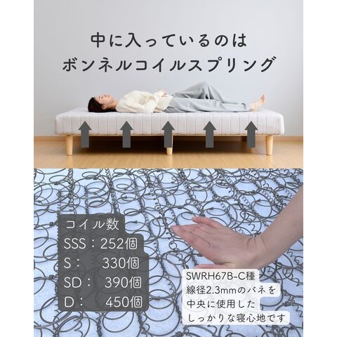 | 商品説明 | ●圧縮梱包で玄関先までお届け、開封後約1~3日で復元します。(環境により時間が前後します。) 2025年9月30日より、脚ホワイト・ロータイプをバリエーション追加しました。 ●組み立て簡単にできる、スプリングマットレス一体型のベッド ●脚高17cmの従来に加え、圧迫感のない10cm高さのロータイプが仲間入り ●静止耐荷重:200kg(保証値ではございません。) 本製品は7000N(700kg相当)の荷重試験をクリアした商品です。 当社では安全を考慮し、本商品は耐荷重200kgに設定しております。 ●独自構造で耐荷重も安心 ●本体内蔵の木枠と、後付の補強枠・脚を取り付けて完成 ●マットレスの張地は滑らかなポリエステル素材を使用 ●ベッド下有効高さ:側面17cm、脚側19.5cm ボンネルコイルタイプ ●コイル数 【S】330個、【SD】390個、【D】450個、【SSS】252個 ●線径:2.3cm ●マット厚:17cm ●プラ脚直径:6.5cm ●脚から脚まで【S/SD/D】幅77.5cm、【SSSのみ】幅69cm |