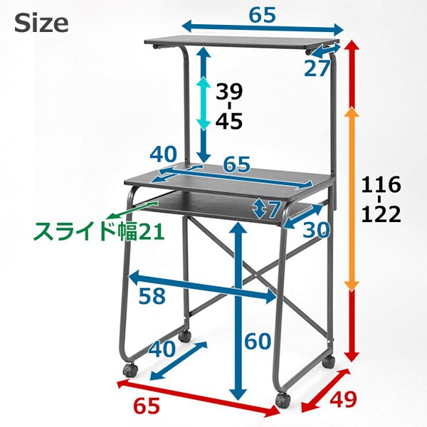 | 商品説明 | ●お得さを追求したシンプルモデル ●上棚は高さ2段階調節可能 ●天板サイズ:幅65 奥行40 高さ39/45cm ●上棚サイズ:幅65 奥行27cm ●スライド棚サイズ:幅58 奥行30 隙間7cm ●スライド幅:21cm ●キャスター4個(うちストッパー付2個) ●デスク下:幅58 高さ60cm ●天板耐荷重:15kg ●上棚耐荷重:5kg ●スライド棚耐荷重:8kg |