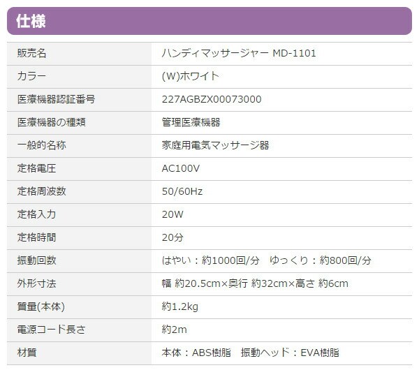 | 材質 | 本体:ABS樹脂 振動ヘッド:EVA樹脂 |