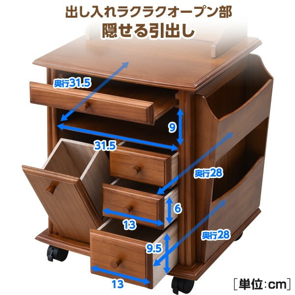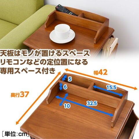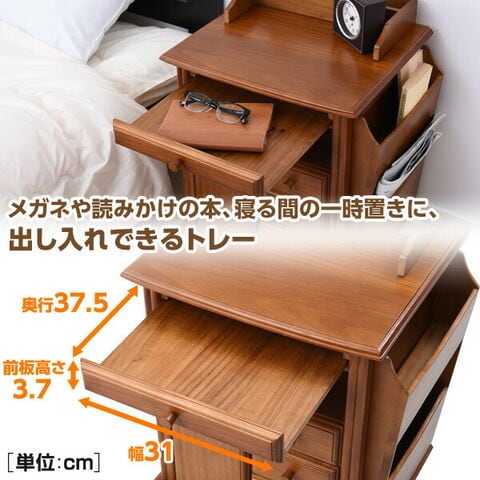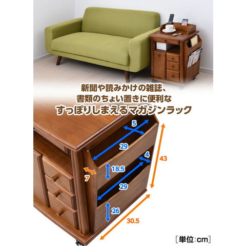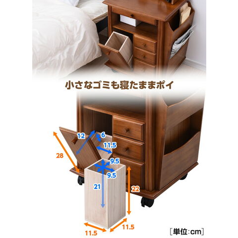 | 商品説明 | ●枕元にケイタイや薬、小物をすっきりひ、ゴミ箱までまとめできる収納ワゴン ●お部屋に温かみを届ける木製タイプ ●キャスター付きで移動や掃除にラクラク ●天板収納部 外寸:35.5 18 7.2cm ●天板収納部 内寸:幅15.5 奥行5 深さ6cm ●天板収納部前スペース:幅32.5 奥行10cm ●天板実寸:幅42 奥行37cm ●床から天板までの高さ:54.5cm ●天板有効 前40/後32.5 前17/後27.5cm ●トレー有効寸法:幅31 奥行37.5 前板高さ3.7cm ●オープン部:幅31.5 奥行31.5 高さ9cm ●引出小:幅13 奥行28 深さ6cm ●引出大:幅13 奥行28 深さ9.5cm ●ゴミ箱外寸:11.5掛ける11.5×高さ22cm ●ゴミ箱内寸;9.5×9.5×深さ21cm ●ゴミ箱扉内:幅11.5 奥行12 側板高さ6/前扉高さ28cm ●マガジンラック外寸:幅30.5 奥行7 高さ43cm ●マガジンラック内寸(上):幅29 5. 奥行5 深さ18.5cm ●マガジンラック内寸(下):幅29 奥行4 深さ26cm |