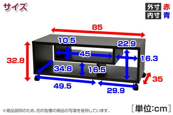 | 商品説明 | ●対応インチ:32型(32V形/32インチ)までのテレビに対応 ●耐荷重:天板30kg、棚板15kg ●キャスター:直径4×高さ5.6cm ●オープン部内寸(中):幅45×奥行34.8×高さ10.5cm ●オープン部内寸(左):幅16.3/49.5×奥行34.8×高さ22.9/16.5cm ●オープン部内寸(右):幅16.3/29.9×奥行34.8×高さ22.9/16.5cm |