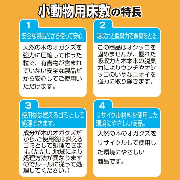 | 商品説明 | ●木のオガクズを使用した小動物用床敷 ●天然のオガクズを圧縮して作った粒だから安全・安心 ●強力におしっこを吸収し、木本来の脱臭力でニオイをとる ●使用後は燃えるゴミとして処理できる ●おがくずを使用した環境にやさしい商品 |
