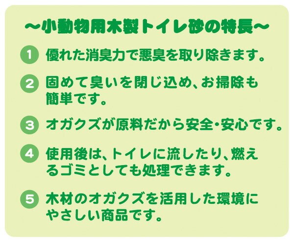 | 商品説明 | ●天然のヒノキ入り ●固めて流せる小動物用木製トイレ砂 ●優れた消臭力で悪臭を取り除く ●しっかり固まるのでお掃除カンタン ●おがくずが原料だから安全・安心 ●トイレに流したり、燃えるゴミとして処理も可能 ●おがくずを活用した環境に優しい商品 |