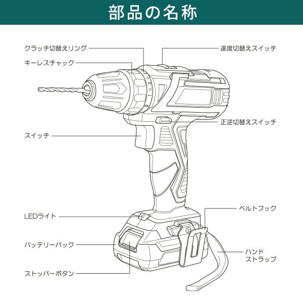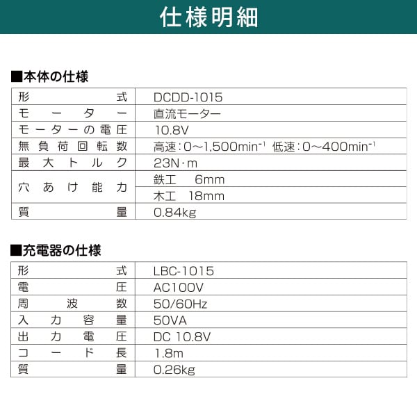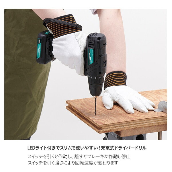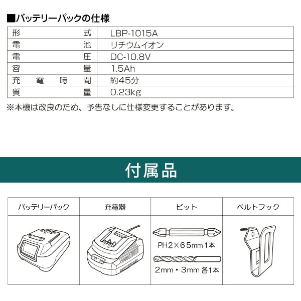 | 商品説明 | ●付属品:バッテリー、充電器、ドライバービット、ドリルビット(2mm、3mm)、ベルトフック ●スリムで使いやすい充電式ドライバードリル ●LEDライト付き ●無段変速 ●スピード切り替え2段階 ●充電時間約45分 ●ベルトフック・ストラップ付き |