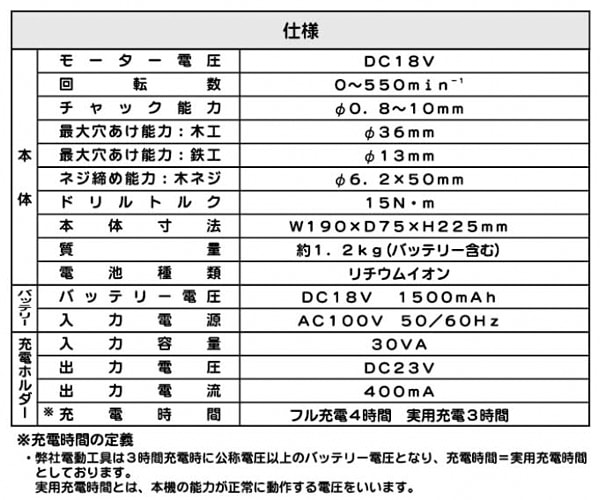 | 商品説明 | ●バッテリー電圧:DC18V (Li-ion) ●バッテリー容量:1500mAh ●最大トルク:15N・m ●回転数:0-550/毎分 ●フル充電時間:約4時間 ※実用充電時間(80%):約3時間 ●チャック能力:直径0.8-10mm ●付属品:バッテリー(本体装着済)、プラスマイナス両頭ビット×2、充電器、充電アダプター ●ビットの交換が簡単なキーレスチャック ●LEDライト付き ●無段変速スイッチで最適な速度で作業が可能 ●穴あけ、ネジ締めに便利なコードレス ●滑りにくいソフトグリップ ●トルク16段階切替 ●最大穴あけ能力:(木工)直径36mm、(鉄工)直径13mm ●ネジ締め能力:(木ネジ)直径6.2×50mm ●メーカー保証1年付き |