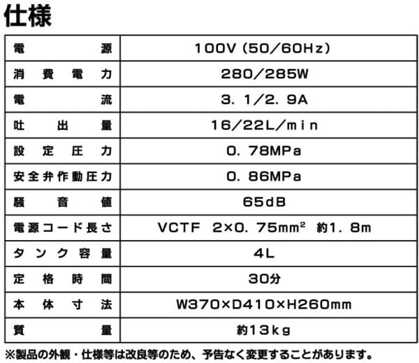 | 商品説明 | ●電源:AC100V 50/60Hz ●電流:3.1/2.9A ●消費電力:280/285W ●設定圧力:0.78MPa ●空気吐出量:16/22L/min ●タンク容量:4L ●空気取出口:1口(圧力調整器付) ●メンテナンスが簡単なオイルレス ●片手で持ち運びできるコンパクトボディ ●小型で高さが低くラックなどへ収納に便利 ●使用場所を選ばない静音タイプ ●自動車のタイヤ・ボール・浮き輪などの空気入れに ●ゴミ・ホコリなどの吹き飛ばしに ●吐出口圧力調整器付で減圧して使用出来る ●騒音値:65dB ●電源コード:VCTF 2c×0.75平方mm 約1.8m ●付属品:ワンタッチカプラソケット1/4in×1、消音器×1、消音パイプ×1 ●メーカー保証1年付き |