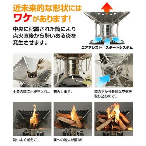 | 商品説明 | ●エアの力で素早く着火!薪への着火を容易にする焚き火台 ●筒下のメッシュ加工により新鮮な空気をとりこむエアアシストスタートシステム ●中央の筒に小枝を入れて着火、新鮮な空気を取り込むことで勢いよく燃えて薪への着火が簡単 ●筒上部をキャップすることで炭火にも対応 ●セット内容:エアスタベース、フィンキャップ、アンダートレイ、収納バッグ、ウイングM |
