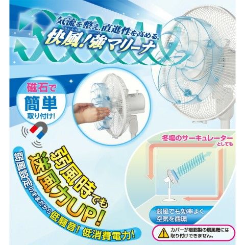| 商品説明 | ●磁石で簡単取り付け ※カバーが樹脂製の扇風機には取り付け出来ません ●9枚の羽根が気流を整え、直進性を高める ●弱風時でも送風力アップ ●弱風設定のままだから低騒音!低消費電力! ●冬場のサーキュレーターとしても ※家庭用(羽根直径30cm)の扇風機でご使用ください ※壁掛用扇風機、天井用扇風機、暖房能力のある製品では使用しないでください |