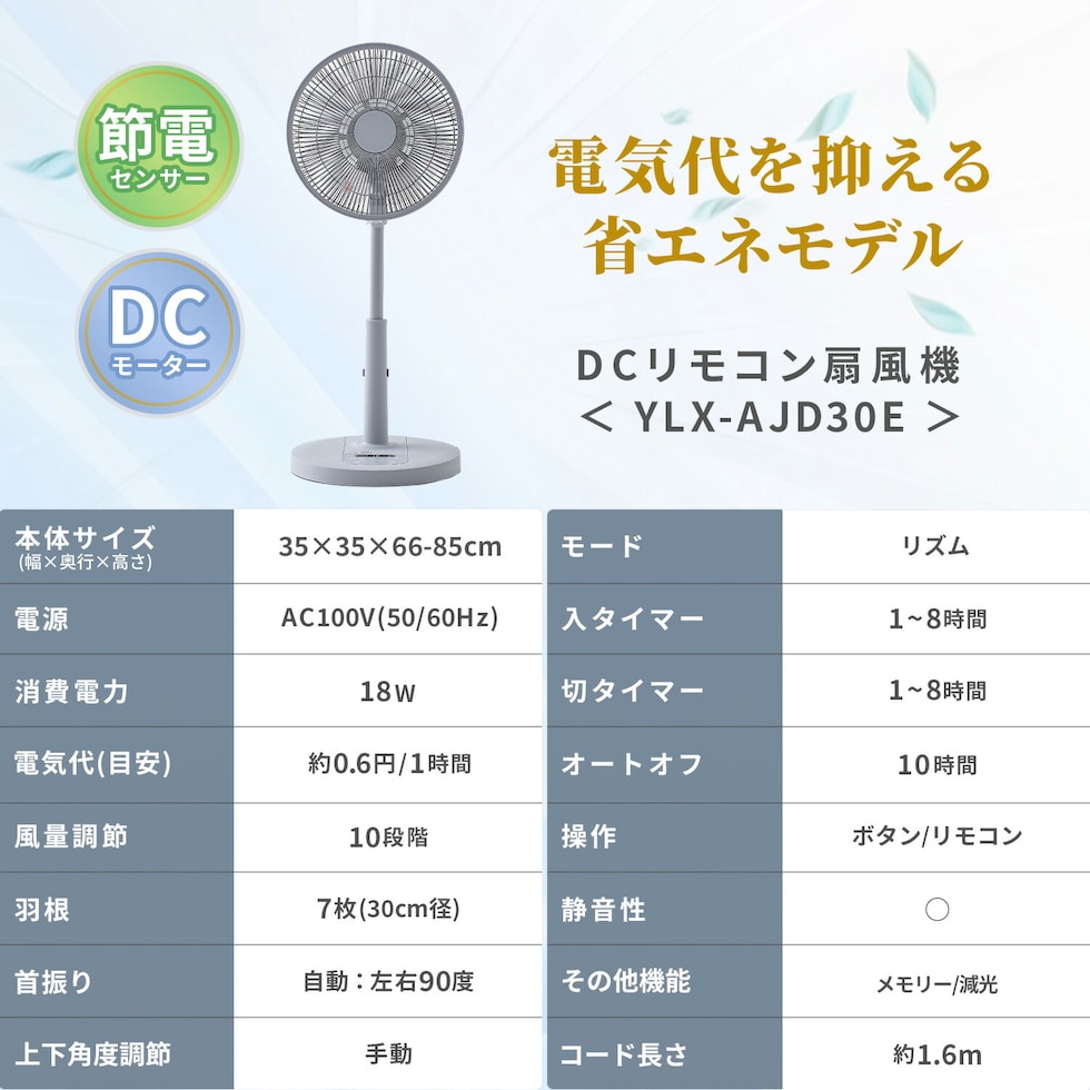 扇風機 dcモーター 節電センサー リビング扇風機 左右自動首振り 風量10段階 静音 リモコン 入切タイマー YLX-AJD30E DC扇風機 リビングファン サーキュレーター 温度センサー 室温センサー 省エネ おしゃれ 山善 YAMAZEN 【送料無料】