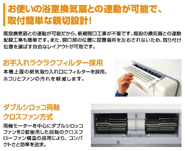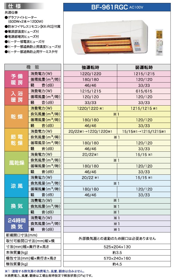| 商品説明 | ●電源:AC100V(50/60Hz) ●消費電力(50/60Hz):【強運転時】(予備暖房)1220/1220W、(入浴暖房)1215/1215W、(乾燥)1220/1220W、(節電乾燥)20/22W→1220/1220W、(風乾燥・涼風)20/22W、【弱運転時】(予備暖房)1215/1215W、(入浴暖房)615/615W、(乾燥)1215/1215W、(節電乾燥)15/15→1215/1215W、(風乾燥・涼風)15/15W ●ヒーター方式:グラファイトヒーター ●適応面積目安:(在来工法)1坪以下、(ユニットバス)1.5坪以下 ●リモコン:防水ワイヤレスリモコン(IPX7) ●今、設置されている換気扇と連動できるコンパクトモデル ●遠赤外線グラファイトヒーターで体をすばやくあたためる ●涼風機能付きで、扇風機のような心地よさで夏も爽快 ●人感センサー付きで、人の動きを感知し自動でオン/オフが可能 ●浴室も洗濯物もしっかり乾燥 ●既設の換気扇との連動可能(新規開口工事不要) ●ダブルシロッコ両軸クロスファン方式を採用、コンパクトさと効率を追求 ●24時間連続換気機能付 ●お手入れラクラクフィルター採用 ●多彩な機能をリモコンで簡単操作 (1)予備暖房:入浴前に浴室を暖房 (2)入浴暖房:入浴中の浴室を暖房 (3)乾燥:標準的な乾燥 (4)節電乾燥:仕上げだけヒーターを使う乾燥 (5)風乾燥:ヒーターを使わない風のみの乾燥 (6)涼風:入浴中、涼しい風でさわやか (7)換気:入浴後の換気 (8)24時間換気:常時、弱運転で浴室内を換気 ●電源コード:1.2m ※商品のみの配送(工事等は行っておりません) |