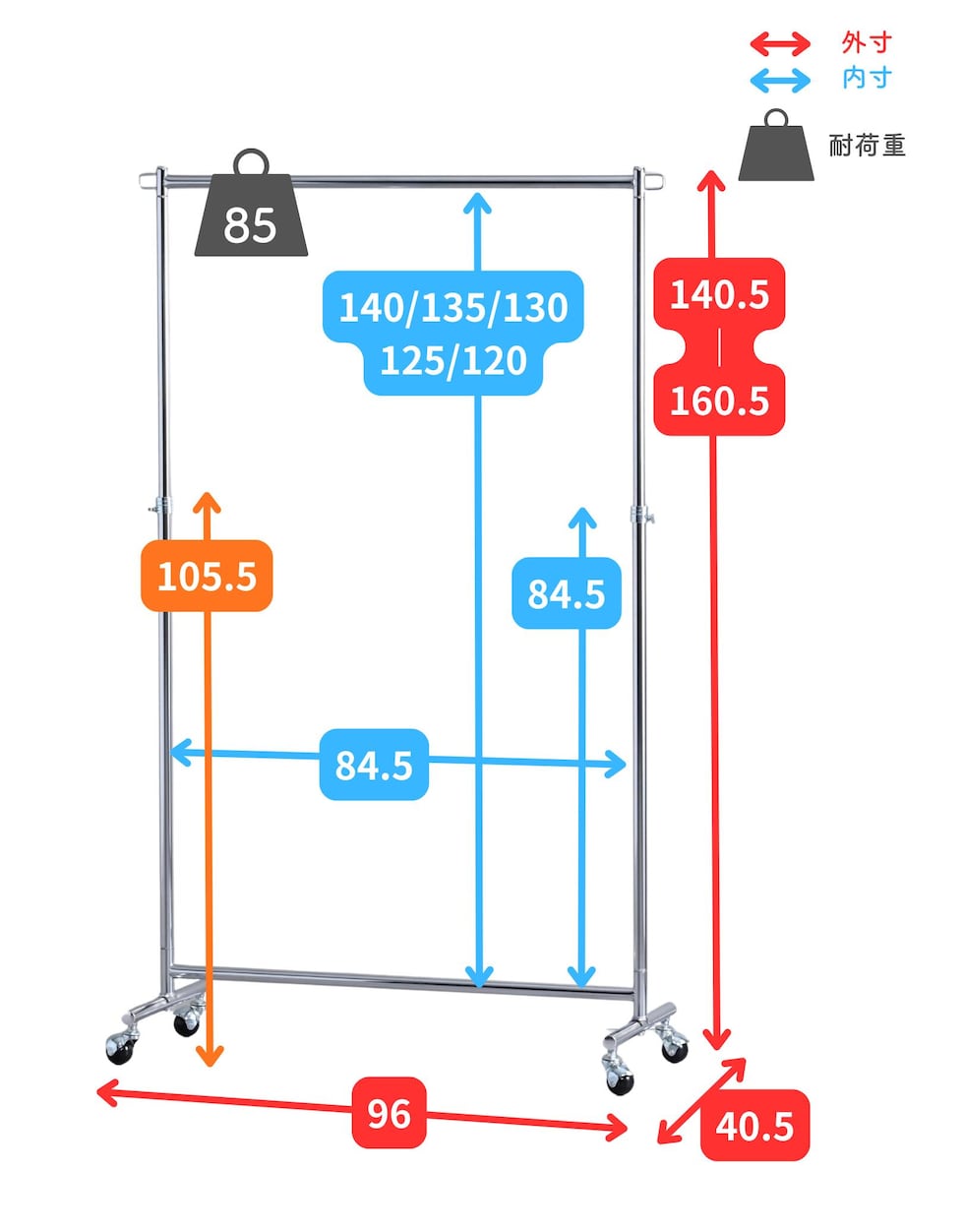 ●ハンガーバー内寸:幅84.5 高さ120-140cm(5cm×5段階)、84.5cm(最低時)