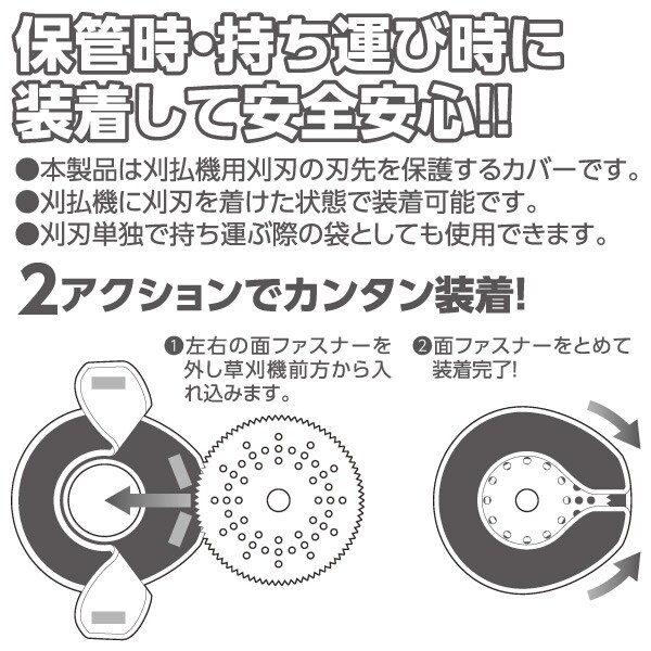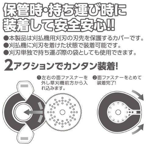 | 商品説明 | ●刈払機用刈刃の刃先を保護するカバー ●保管時/持ち運び時に装着して安全安心 ●刈払機に刈刃を着けた状態で装着可能 ●刈刃単独で持ち運ぶ際の袋としても使用可能 ●外径230mm、255mmに対応 ●2アクションで簡単装着 |