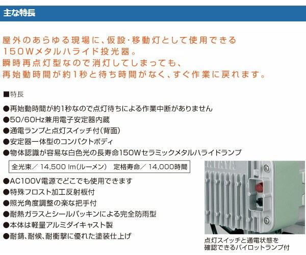 YAMAZEN ヤマゼン 山善 通販 ハタヤリミテッド 瞬時再点灯型 150W メタルハライドライト 5m 電線付フロアスタンドタイプ 投光器 照明 作業灯 照明用品 ワークライト ライト 工事用品 土木 工事