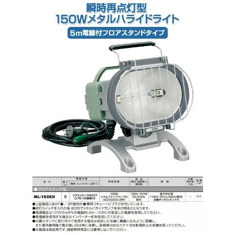 瞬時再点灯型150Wメタルハライドライト 5m電線付フロアスタンドタイプ ML105KH 投光器 照明 作業灯 照明用品 ワークライト ライト 工事用品 ハタヤ(HATAYA) 【送料無料】
