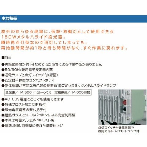 ●物体認識が容易な、白色光の長寿命150Wメタルハライドランプです(全光束:14500lm、定格寿命:14000時間)