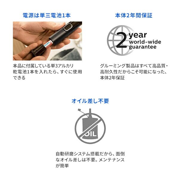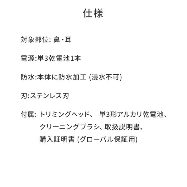 | 商品説明 | ●鼻毛、耳毛を簡単かつ快適にトリミング ●安全性と快適性を重視して設計された鼻毛・耳毛カッター。刃は保護ガードシステムに覆われ、肌に直接触れません ●革新的なデュアルサイドプレシジョントリマー(精密二重ステンレス刃)により、どんな角度からでも簡単にトリミング ●防水仕様なのでお手洗いが簡単!水道水で洗い可能(浸水不可) ●使い方は簡単!デバイスの電源をON/OFFするだけ片手操作 ●付属のソフトポーチで、収納・持ち運びができ便利 ●オイル差し不要 ●グルーミング製品はすべて高品質・高耐久性だからこそ可能になった、本体2年保証 【仕様】 ●対象部位:鼻・耳 ●電源:単3乾電池1本 ●使用時間:約84分 ●防水:本体に防水加工(浸水不可) ●刃:ステンレス刃 ●付属:トリミングヘッド、単3形アルカリ乾電池、クリーニングブラシ、取扱説明書、購入証明書(グローバル保証用) |