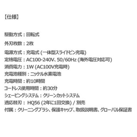 | 商品説明 | ●世界シェアNo.1の電動シェーバーブランド ●ポータブルサイズでわずか113gと軽量。旅行や出張に最適 ●ヨーロッパ生まれの深剃りクリーンカットシステムが、肌にぴったりと密着して効率的に深剃り ●自動研磨システム搭載で常にシャープな切れ味が続く ●シェーバーの刃を肌により近づけ密着感を実現。独立したフロートヘッドが顔の輪郭にピタッとフィット! ●充電コード不要の便利な一体型電源プラグ ●ニッケル水素充電池搭載。約10時間で満充電状態になり、約30分間使用可能 ●海外電圧対応。旅行や海外の方へのプレゼントに最適 【仕様】 ●対応電圧:AC100-240V(海外使用対応)50/60Hz ●電源方式:充電式/ニッケル水素充電池 ●充電時間:フル充電約10時間 ●使用時間:約30分 ●最大消費電力:5.4W ●待機電力:0.25W以下 ●セット内容:本体、シェービングユニット、取扱説明書、グローバル保証書、保護キャップ、クリーニングブラシ ●保証:メーカー保証2年(本体) |