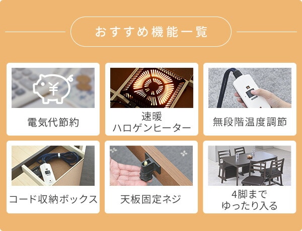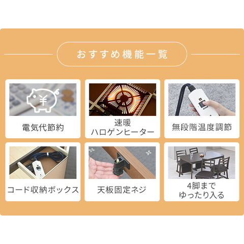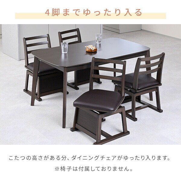 | 商品説明 | ●電源:100V (50Hz/60Hz) ●ヒーター型番:MHU-601E ●消費電力:600W ●電気代目安(1時間あたり):(強)約5.6円、(弱)約2.2円 ※電力料金目安単価1kWhあたり31円(税込)で算出 ●コード収納ボックス付き ●テーブルとしても年中使用できるデザイン ●ヒーターのでっぱりをおさえた薄型設計 ●高級感のある木目天板 ●こたつの高さがある分ダイニングチェアが入ります ●メーカー保証:1年 ※2025年8月より型番をGDT-HDN1353DBへ変更しています |