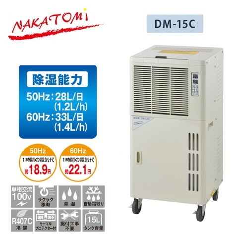 | ナカトミ NAKATOMI 除湿機 温度制御付き 業務用 単相100V 全閉式 大型ドレンタンク容量15L 除湿能力最大33L キャスター付 直接排水 DM-15C |