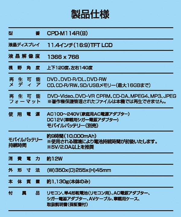 | 商品説明 | ●電源:AC100V-240V(家庭用ACアダプター)、DC12V(車載用シガー電源アダプター)、モバイルバッテリー(別売) ●消費電力:約12W ●液晶ディスプレイ:11.4インチ(16:9) ●解像度:1366×768 ●視野角度:上下120度、左右140度 ●再生可能メディア:DVD、DVD-R、DVD-RDL、DVD-RW、CD、CD-R、CD-RW、SD、USBメモリー(最大16GBまで) ●再生可能フォーマット:DVD-Video、DVD-VR、CPRM、CD-DA、MPEG4、MP3、JPEG ※著作権保護管理されたファイルは本機では再生できません ●パソコン不要で録音できるCDリッピング機能搭載 ●10,000mAhモバイルバッテリー使用で約9時間駆動 ●セット内容:本体、リモコン、リモコン用電池(単4形乾電池×2本)、AC電源アダプター、シガー電源アダプター、AVケーブル、車載用ケース、取扱説明書 ●メーカー保証:1年 ※2022年4月1日に型番をCPD-M114→CPD-M114Rに変更しました |