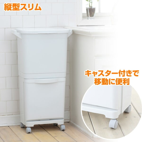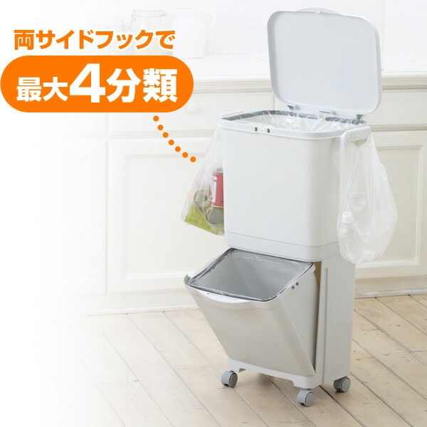 | 商品説明 | ●容量:(上段)30L、(下段)15L ●縦型スリム ●キャスター付きで移動に便利 ●ポリ袋止め付き ●両サイドフックで最大4分類 |