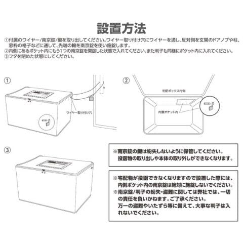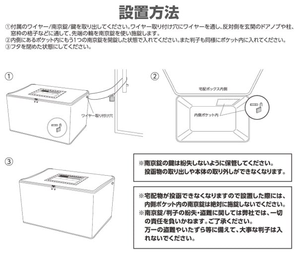 ※宅配BOXが南京錠で施錠したままでは、宅配物を投函できませんので、必ず南京錠を開錠した状態で内側のポケットに入れて設置してください。