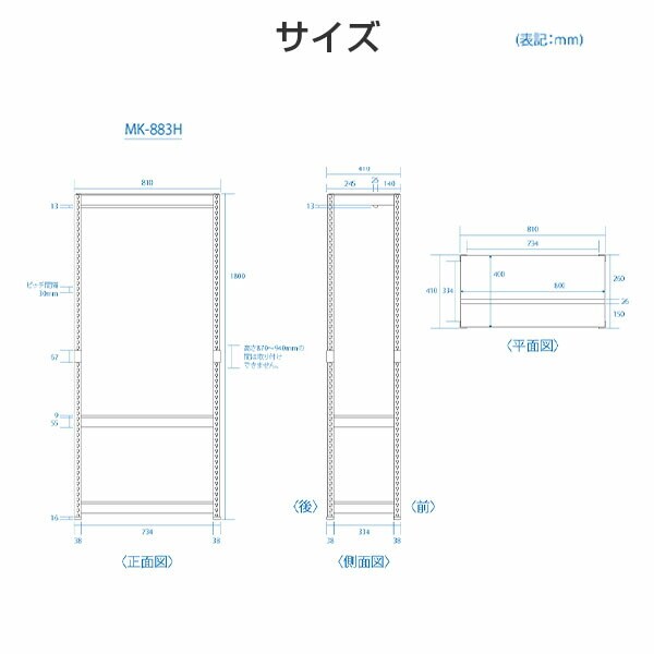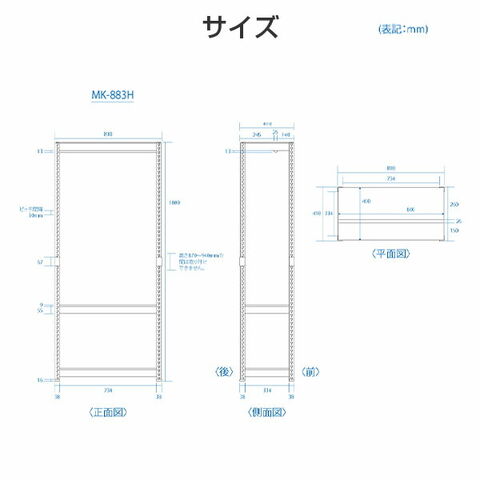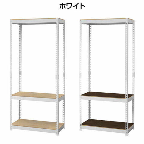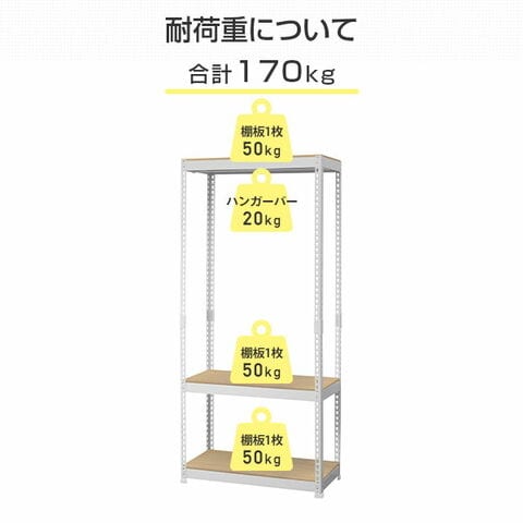 | 材質 | フレーム:スチール(粉体塗装) 棚板:合成樹脂化粧繊維版(塩化ビニル樹脂) ハンガーバー:ステンレス |