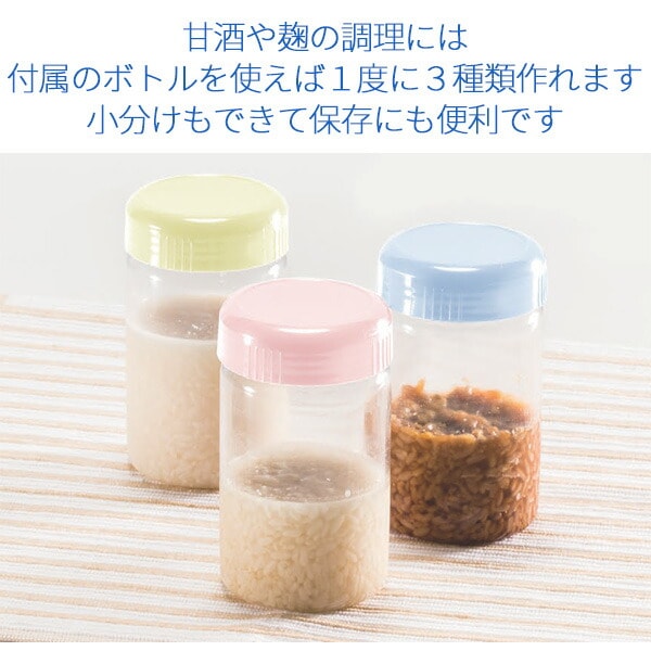 | 商品説明 | ●原産国:中国 ●電源:AC100V (50Hz/60Hz) ●消費電力:30W ●電源コード長さ:1m ●食材を入れてセットするだけ!簡単操作の発酵食メーカー ●レシピブック付き ●数種類の発酵食が簡単に作れる!ヨーグルト、カスピ海ヨーグルト、納豆、醤油麹、塩麹、甘酒、京風白味噌など ●容器でそのまま保存も可能 (容器×1、ボトル×4付属) ●温度調節:25-65度 ●タイマー調節:1-48時間 ●メーカー保証1年付き ※2020年2月よりブルー色追加 |
