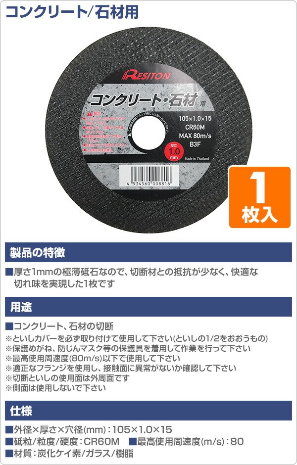 YAMAZEN ヤマゼン 山善 通販 RESITON レジトン 切削工具 研磨材 DIY 工具 ガーデン 電動工具 エア工具 電動工具パーツ アクセサリ 切断砥石 電動工具用アクセサリ 金の卵 コンクリート石材用 105×1.0×15 CR60M 105 1.0ミリ 切れ味抜群 耐久性抜群 薄型砥石 当たり柔らかい 欠けにくい コンクリート切断 石材切断 ブロック切断 御影石切断 コンクリート切断欠けにくい 石材切断欠けにくい ブロック切断欠けにくい 御影石切断欠けにくい コンクリート切る コンクリート切りたい 石材切る 石材切りたい ブロック切る ブロック切りたい 御影石切る 御影石切りたい グラインダー サンダー 充電グラインダー 充電サンダー ダイヤ ダイヤモンドカッター |