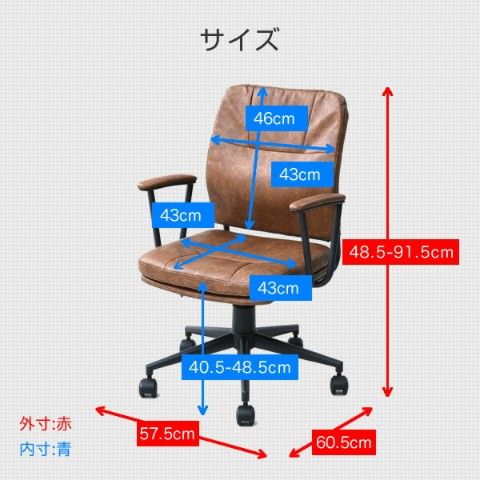 | 商品説明 | ●ブルックリンスタイルのチェア ●アンティーク調PUレザーがとってもおしゃれ ●アームレスト付き ●5個のキャスターでデスク周りをラクラク移動 ●座面サイズ:幅43 奥行43cm ●座面高さ:40.5-48.5cm ●背もたれサイズ:幅43 奥行46cm |