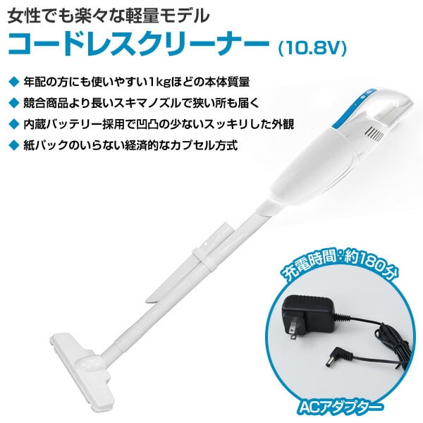 | 商品説明 | ●電源:DC10.8V ●電池容量:1.5Ah ●吸込仕事率:(ターボ)20W、(標準)10W ●使用時間:(ターボ)約12分、(標準)約24分 ●集じん容量:600ml ●充電時間:約180分 ●付属品:T型ノズル、延長パイプ、スキマノズル、内蔵バッテリー、ACアダプター ●女性でも使いやすい軽量モデル ●紙パックのいらない経済的なカプセル方式 ●メーカー保証1年付き |