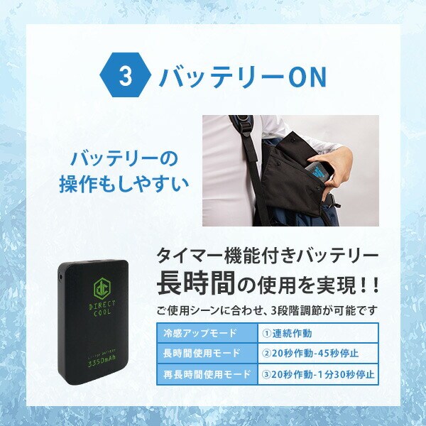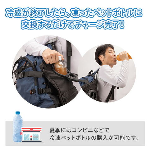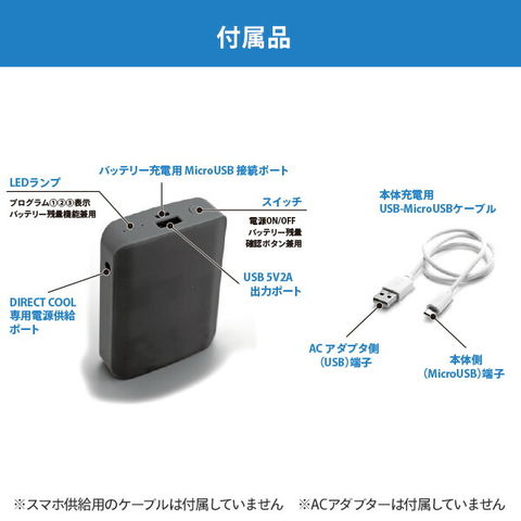 | 商品説明 | ●運転モード:(1)連続運転 (2)間欠運転/20秒運転→45秒休止 (3)間欠運転/20秒運転→90秒休止 ●冷却能力持続時間:ペットボトル650ml使用、間欠運転(3)で最大約2~3時間(環境温度33度、実験値) ●充電地持続時間:(1)約7時間 (2)約17時間 (3)約24時間 ●充電池:3350mAh ●付属品:バッテリー3350mAh、充電用USBケーブル |