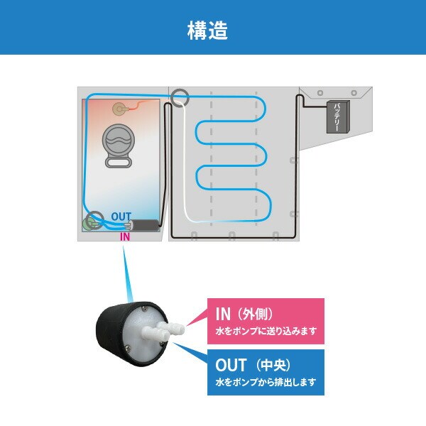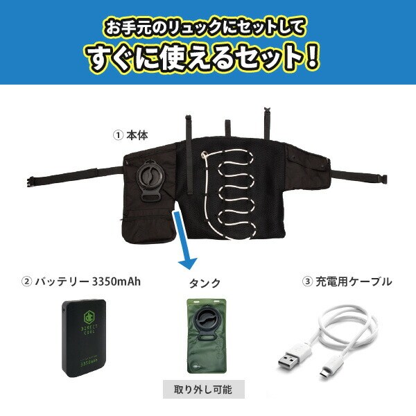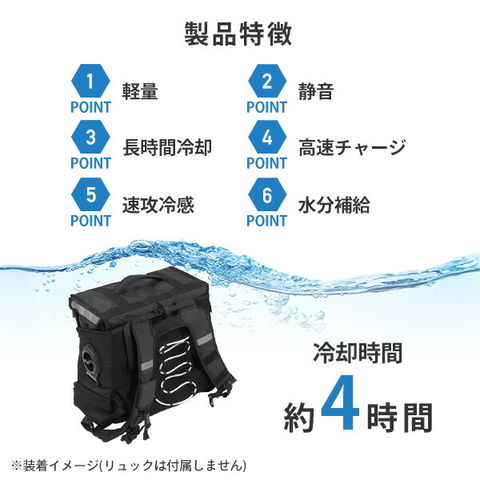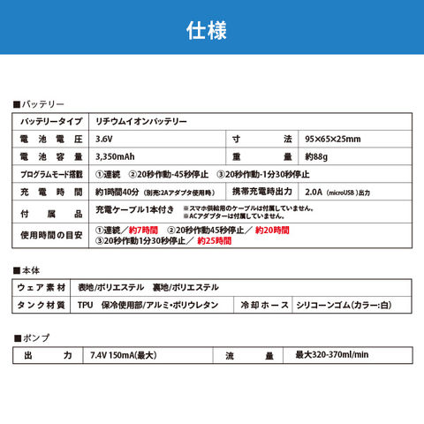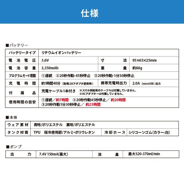 | 材質 | ウェア:ポリエステル タンク:TPU 保冷使用部/アルミ、ポリウレタン 冷却ホース:シリコーンゴム(白) |