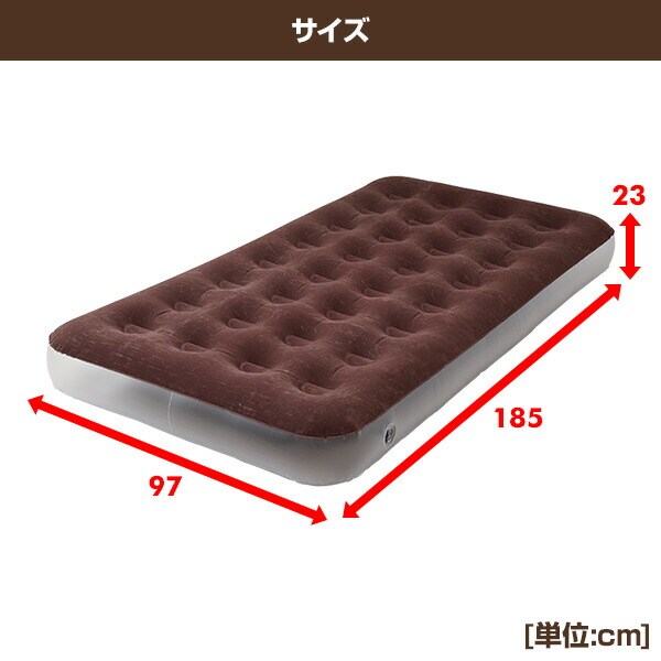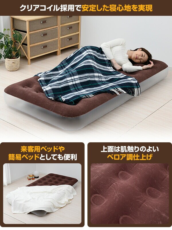 | 商品説明 | ●上面は肌触りのよいベロア調仕上げ ●クリアコイル採用で安定した寝心地を実現 ●アウトドア、防災、車中泊など多用途で使えます ●来客用ベッドや簡易ベッドとしても便利 ※当商品は簡易型ベッドです。常設用ベッドとは異なりますので予めご了承お願いします。 ※ポンプは付属しておりません。 |
