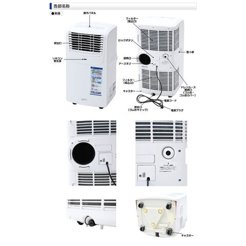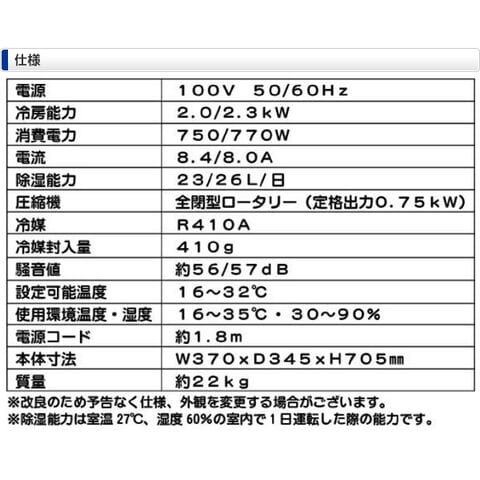 | 商品説明 | ●電源:AC100V (50Hz/60Hz) ●冷房能力:(50Hz)2.0KW、(60Hz)2.3KW ●除湿能力:(50Hz)23L/日、(60Hz)26L/日 ※室温27度、湿度60%の室内で1日運転した際の能力値になります ●消費電力:(50Hz)750W、(60Hz)770W ●電流:(50Hz)8.4A、(60Hz)8.0A ●冷媒:R410A ●冷媒封入値:410g ●冷房専用タイプ ●圧縮機:全閉型ロータリー(定格出力:0.75kW) ●電源コード:約1.8m ●騒音値:(50Hz)約56dB、(60Hz)約57dB ●お好きな場所を冷房、除湿、送風可能 ●冷房モード:16度から32度の設定可能 ●ノンドレン構造(ドレンホース不要) 冷風運転時、面倒な水捨ての必要がありません ※使用環境によっては排水が必要な場合がございます ※除湿運転時はドレインホースを使用する必要があります ●付属の窓パネルで排熱を屋外へ出せば、効率よく冷房できる ●除湿モード:部屋の湿気を取って、結露の発生や、カビの繁殖など抑制 ※除湿運転時は温度設定はできません ●送風モード:風量2段階調整可能(強・弱) 扇風機のような心地よい風を送風します ※送風運転時は温度設定はできません ●便利な入/切タイマー:1から24時間まで設定可能 ※1時間単位で設定可能 ●コンパクト設計、キャスター付きなので簡単設置、移動も楽々 ●付属品:リモコン(単4電池2本使用)×1、排熱ダクト(約0.3mから1.2m伸縮タイプ)×1、排熱ダクト用本体側継手×1、窓パネル×1、窓パネル用キャップ×1、ドレンホース(ゴムパッキン付き)×1 ●使用環境温度:約16から35度 ●使用環境湿度:30から90% ●窓パネルを取り付ける際の注意点 ・窓の高さを測ってください ・窓パネルは窓の高さが785mmから1415mmまでの対応になります ※785mmから1020mmまででご使用する際は取り付け長さに合わせてパネルをノコギリ等で切断して調節が必要になります ※詳しい取付方法については同梱される取扱説明書をご参照ください ●設置に関する注意点:効率よく運転するため「上方50cm以上、背面50cm以上、両側面30cm以上、前面50cm以上」のスペースを必ず確保して設置してください >※2025年2月より商品型式がMAC-20→MAC-20Nに変更しております。 |