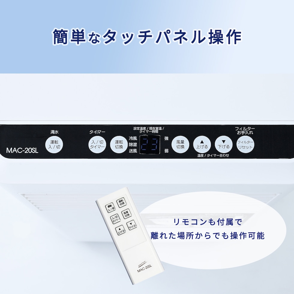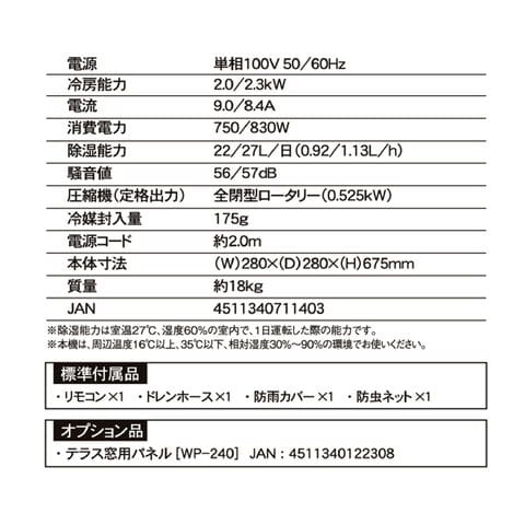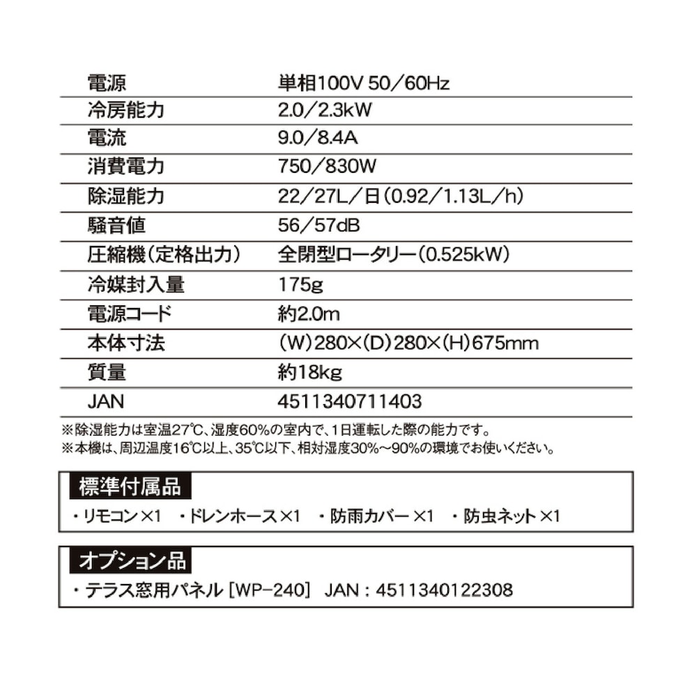 | 商品説明 | ●電源:AC100V (50Hz/60Hz) ●消費電力:(50Hz)750W、(60Hz)830W ●電流:(50Hz)9.0A、(60Hz)8.4A ●冷房能力:(50Hz)2.0KW、(60Hz)2.3KW ●除湿能力:(50Hz)22L/日、(60Hz)27L/日 ※室温27度、湿度60%の室内で1日運転した際の能力値になります ●冷媒R32採用 ●冷媒封入量:175g ●圧縮機:全閉型ロータリー(定格出力:0.525kW) ●電源コード:約2.0m ●騒音値:(50Hz)約56dB、(60Hz)約57dB ●お好きな場所を冷房、除湿、送風可能 ●冷房モード:16度から32度の設定可能 ●ノンドレン構造(ドレンホース不要) 冷風運転時、面倒な水捨ての必要がありません ※使用環境によっては排水が必要な場合がございます ※除湿運転時はドレインホースを使用する必要があります ●付属の窓パネルで排熱を屋外へ出せば、効率よく冷房できる ●除湿モード:部屋の湿気を取って、結露の発生や、カビの繁殖など抑制 ※除湿運転時は温度設定はできません ●送風モード:風量2段階調整可能(強・弱) 扇風機のような心地よい風を送風します ※送風運転時は温度設定はできません ●便利な入/切タイマー:1から24時間まで設定可能 ※1時間単位で設定可能 ●コンパクト設計、キャスター付きなので簡単設置、移動も楽々 ●付属品:リモコン(単4電池2本使用)×1、排熱ダクト(約0.3mから1.2m伸縮タイプ)×1、排熱ダクト用本体側継手×1、窓パネル×1、窓パネル用キャップ×1、ドレンホース(ゴムパッキン付き)×1 ●使用環境温度:約16℃から35℃以下 ●使用環境湿度:相対湿度30~90% ●窓パネルを取り付ける際の注意点 ・窓の高さを測ってください ・窓パネルは窓の高さが785mm~1415mmまでの対応になります ※785mmから1020mmまででご使用する際は取り付け長さに合わせてパネルをノコギリ等で切断して調節が必要になります ※詳しい取付方法については同梱される取扱説明書をご参照ください ●設置に関する注意点:効率よく運転するため「上方50cm以上、背面50cm以上、両側面30cm以上、前面50cm以上」のスペースを必ず確保して設置してください ※2026年2月より商品型式がMAC-20N→MAC-20SLに変更しております。商品型式の変更に伴い、仕様も変更されております。 |