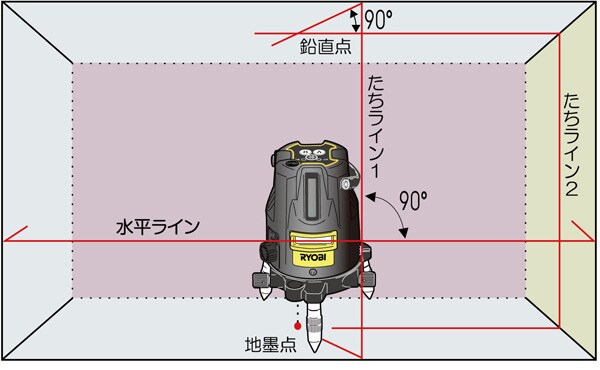 レーザー墨出器 (水平ライン約120度/垂直ライン×2本/鉛直点/おおがね/地墨点)