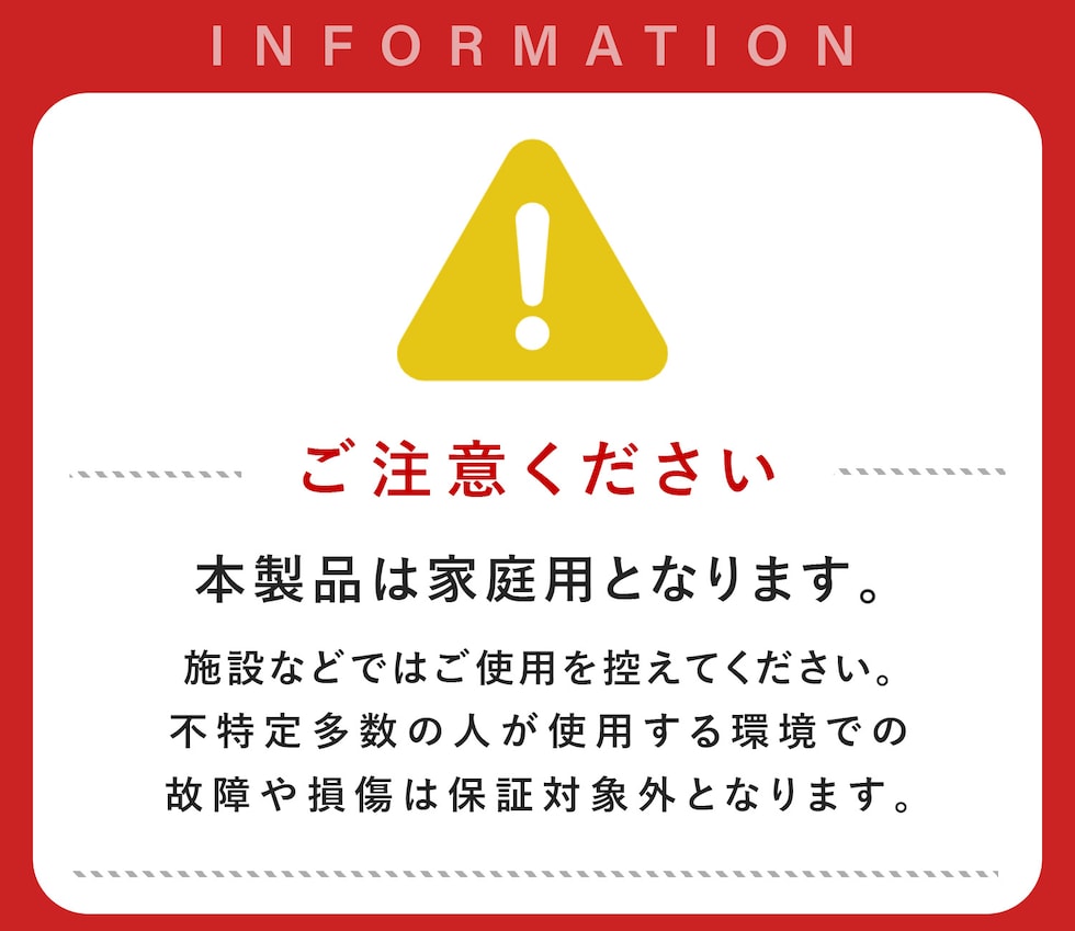 ※本製品は家庭用となります。施設などではご使用を控えてください。不特定多数の人が使用する環境での故障や損傷は保証対象外となります。