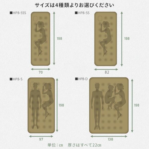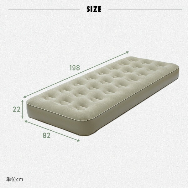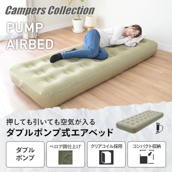| 商品説明 | ●押しても、引いても空気が入る、ダブルアクション仕様のポンプ付き ●クリアコイルを採用し、より安定した寝心地を実現 ●肌触りのよいベロア調仕上げ ●空気を抜けばコンパクトに収納可能。防災や急な来客や荷物がかさばるキャンプなどでも大活躍 |