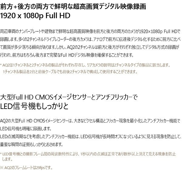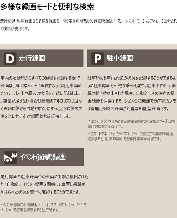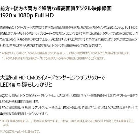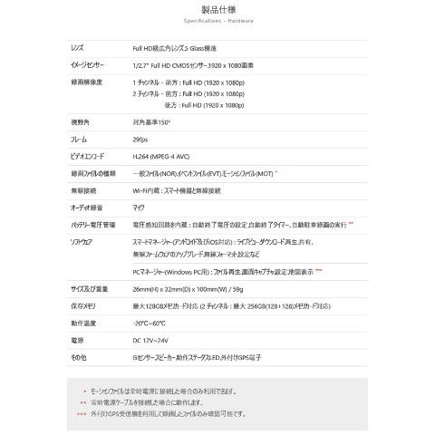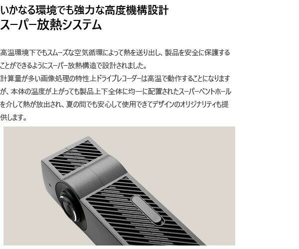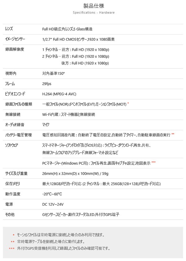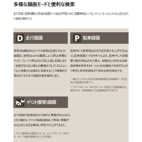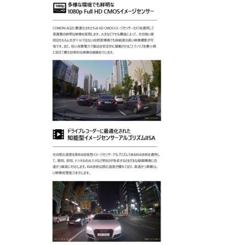 | 商品説明 | ●セット内容:本体、マニュアルCD、クイックガイド、製品の据置台、両面テープ、メモリーカード、カードアダプタ、コード整理クリップ、シガージャック電源ケーブル ●1920×1080p フルHDの鮮明な超高画質映像録画 ●Wi-Fi搭載 ●最大150度の広視野角 ●最大128GB使用可能 ●駐車中モーション感知知能型録画 ●12V/24V車兼用 ●高品質マイク内蔵 ●前方、後方の両方で鮮明な超高画質デジタル映像録画(※後方カメラは別売り) ●大型フルHD CMOSイメージセンサーとアンチフリッカーでLED信号機もしっかりと録画 ●多彩な録画モード:走行録画、駐車録画、イベント(衝撃)録画 ●スーパーキャパシタ内蔵 ●メーカー保証1年付き (※ただしmicroSDカードは保証対象外) |