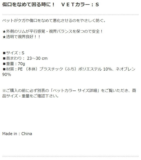 | 商品説明 | ●怪我や手術の患部を気にするペットに! ●首周り23-30cm ●半透明の素材なので視界良好 ●外側のリムが平行感覚・視界バランスを保つので安全 ※サイズ違いによる交換は出来ません。予めサイズ詳細をご覧頂きご確認ください |