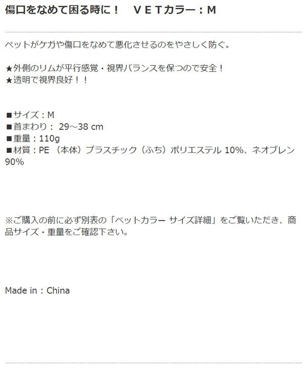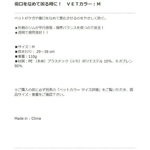 | 商品説明 | ●怪我や手術の患部を気にするペットに! ●首周り29-38cm ●半透明の素材なので視界良好 ●外側のリムが平行感覚・視界バランスを保つので安全 ※サイズ違いによる交換は出来ません。予めサイズ詳細をご覧頂きご確認ください |