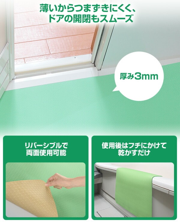 | 商品説明 | ●耐熱温度:60度 ●薄いからつまずきにくく、ドアの開閉もスムーズ ●リバーシブルで両面使用可能 ●冬場ではお風呂場のヒンヤリが緩和するのでヒートショック対策にもなります ●使用後はフチにかけて乾かすだけ ●厚み3mm |